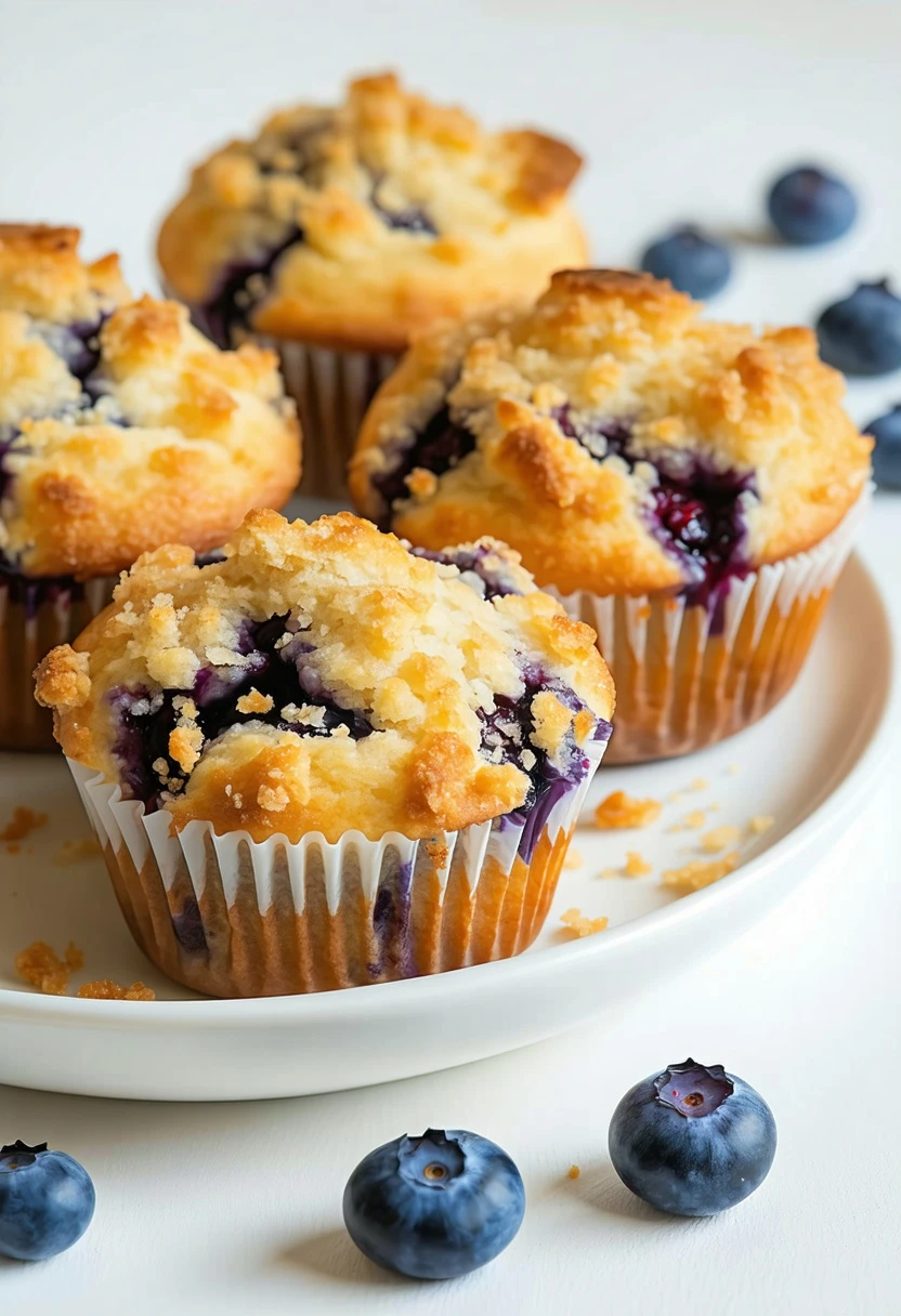 Delightful blueberry muffins topped with a sweet and crunchy streusel, perfect for breakfast or a snack.