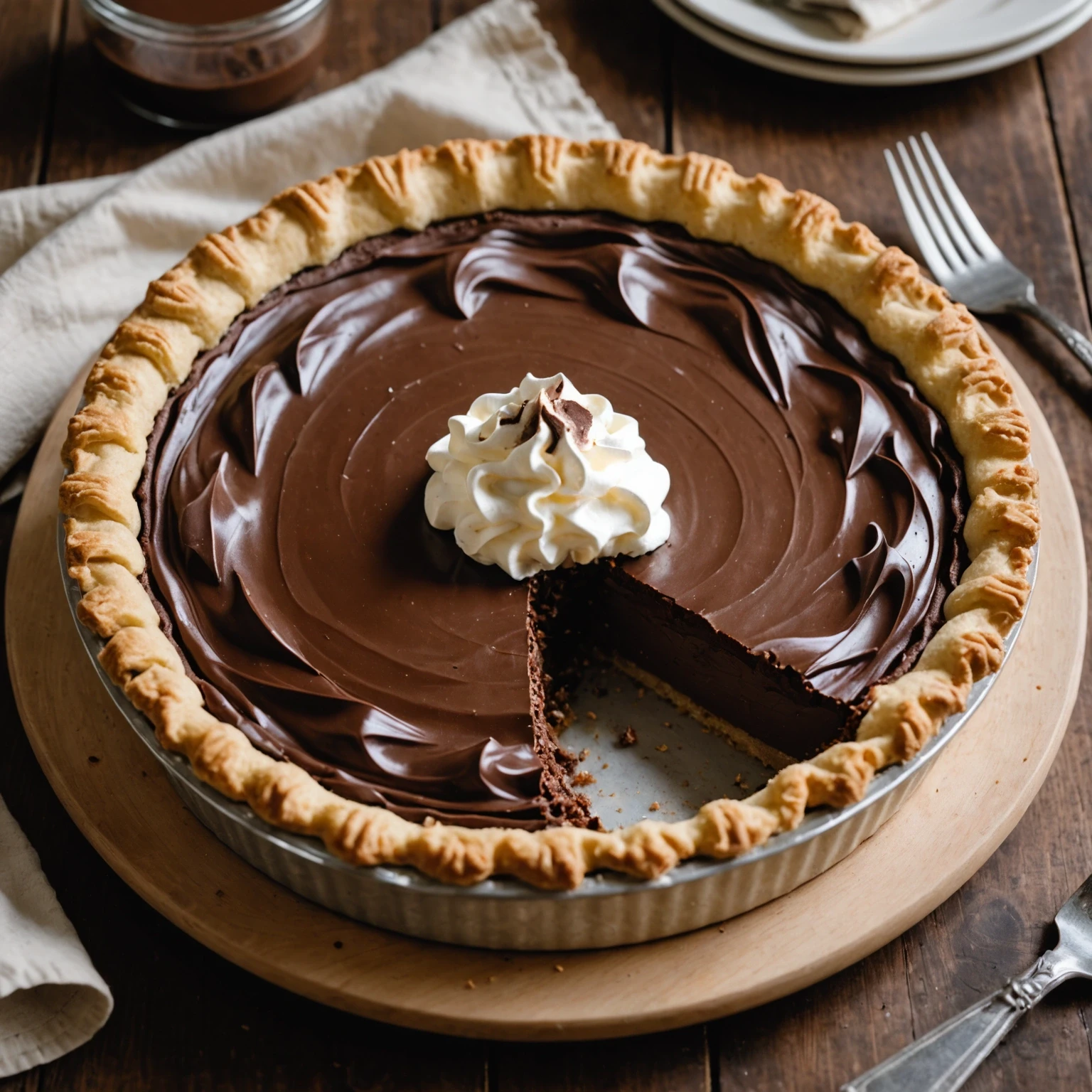 A rich and creamy chocolate pie with a smooth and silky texture, nestled in a buttery crust.