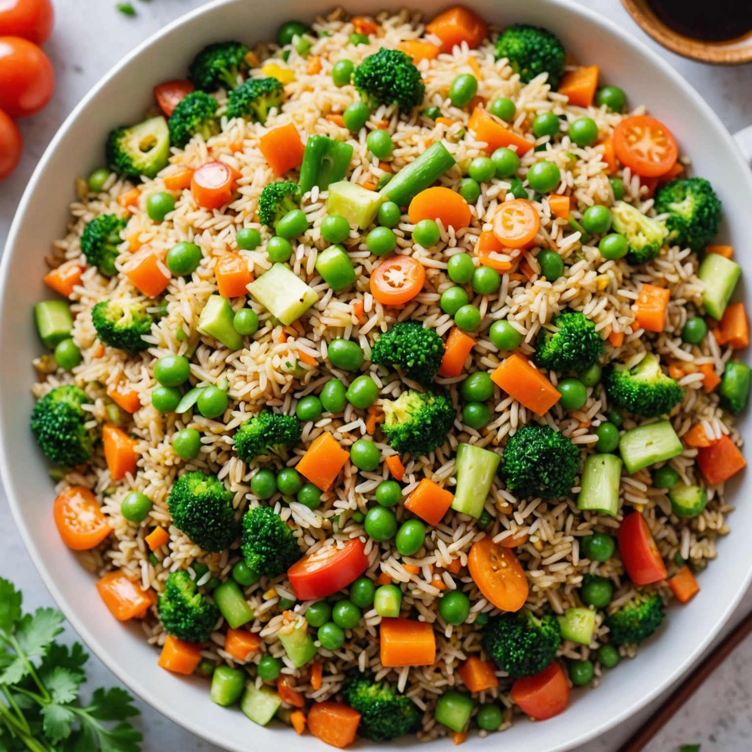 A colorful and nutritious dish packed with fresh vegetables and fragrant rice, perfect for a quick meal or side dish.
